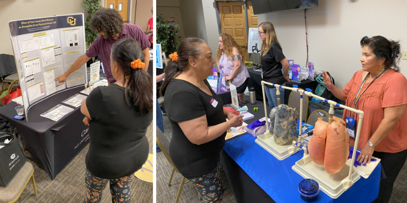 Left: At the Pueblo Research Roadshow, attendee Nancy Gius listens as PhD student Marcus Richards explains research led by CU Cancer Center member Tin Tin Su, PhD, into the cancer impact of combinations of heavy metals in Pueblo's soils. Right: Gius hears Adela Cota-Gomez, PhD, the CU Cancer Center’s assistant director for education administration, explain how cancer can impact the lungs. Photos by Mark Harden | CU Cancer Center.
