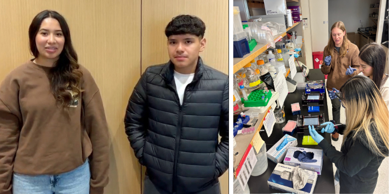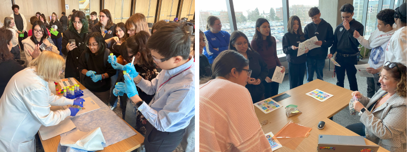 Photo at left: Laila Olivas Balderas and Rogelio Lopez-Beltran, both seniors at Westminster High School, at Learn About Cancer Day on April 18, 2025. Right: Students visit a cancer lab. Photos by Devon Balent | CU Cancer Center.