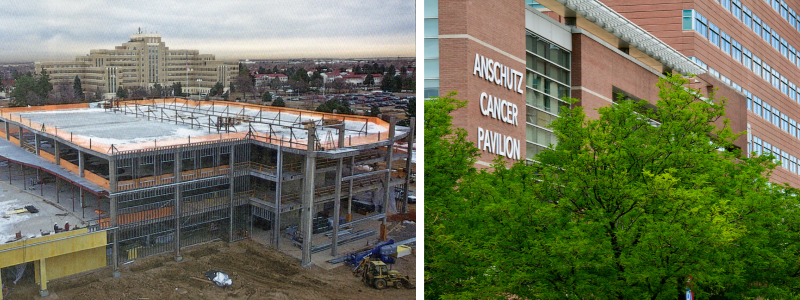 Left: Construction of what would become the Anschutz Outpatient Pavilion and the Anschutz Cancer Pavilion in an early 2000 photo. Right: The Anschutz Cancer Pavilion today, following a major expansion in 2012.