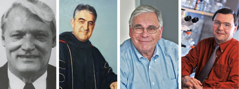 Key figures in the CU Cancer Center's early history. From left: former CU Department of Medicine Chair Robert Schrier, MD, who recruited Paul Bunn, Jr., MD, to CU; Joseph St. Geme Jr., MD, a former dean of the CU School of Medicine, who put Bunn in charge of organizing the CU Cancer Center; Richard Krugman, MD, a longtime CU School of Medicine dean and a staunch supporter of the CU Cancer Center; Dan Theodorescu, MD, PhD, who succeeded Bunn as CU Cancer Center director.