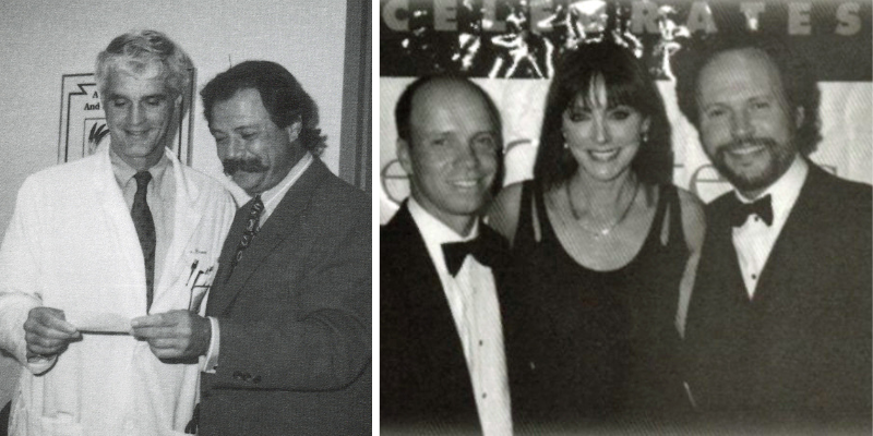 Early philanthropic milestones for the CU Cancer Center. Left, in an undated photo, CU Cancer Center Director Paul Bunn Jr., MD, receives a donation from philanthropist Michael Geller following a Wines for Life fundraiser, which Geller founded in honor of his late brother. Right: Olympic gold-medal skaters Scott Hamilton and Peggy Fleming, both cancer survivors, with actor Billy Crystal at a 1998 CU Cancer Center fundraiser.