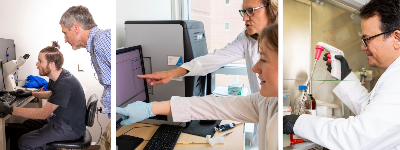 CU Cancer Center research in action. From left: the labs of James DeGregori, PhD; Heide Ford, PhD; and Eduardo Davila, PhD.