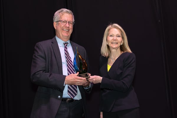 Daniel Wilson, DDS, receives the CU School of Dental Medicine Career Achievement Award, presented by Dean Denise Kassebaum, DDS, MS, at the DDS Class of 2025 Graduation Banquet and Awards Ceremony.