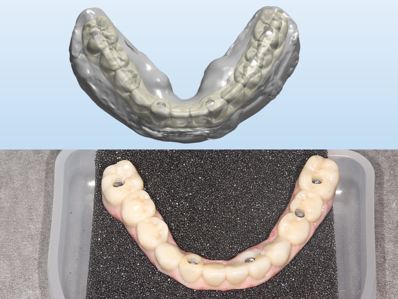 The dental team took digital impressions and designed the implant prosthesis with CAD/CAM technology (top image, courtesy of Gnathodontics, LTD), which was then used to fabricate the final prosthesis (bottom image).