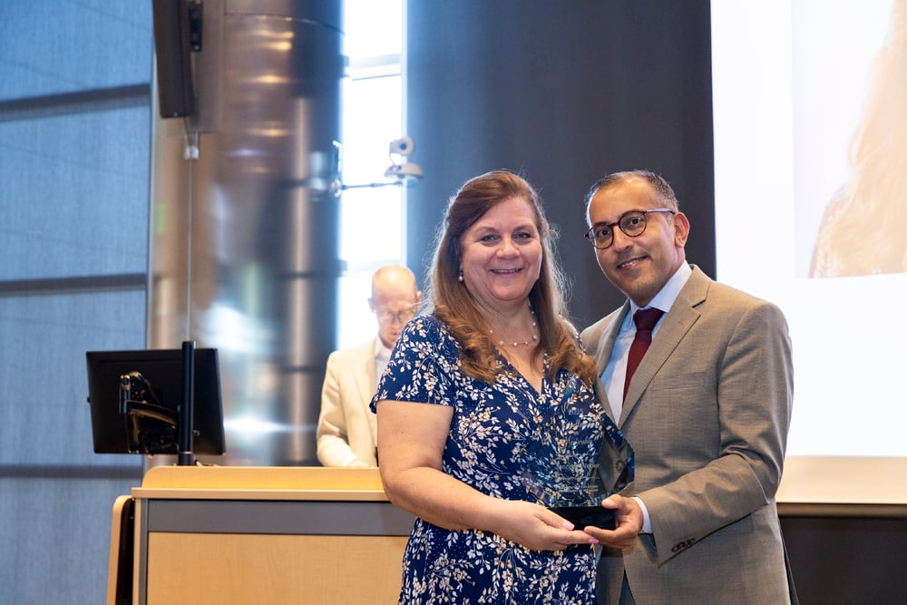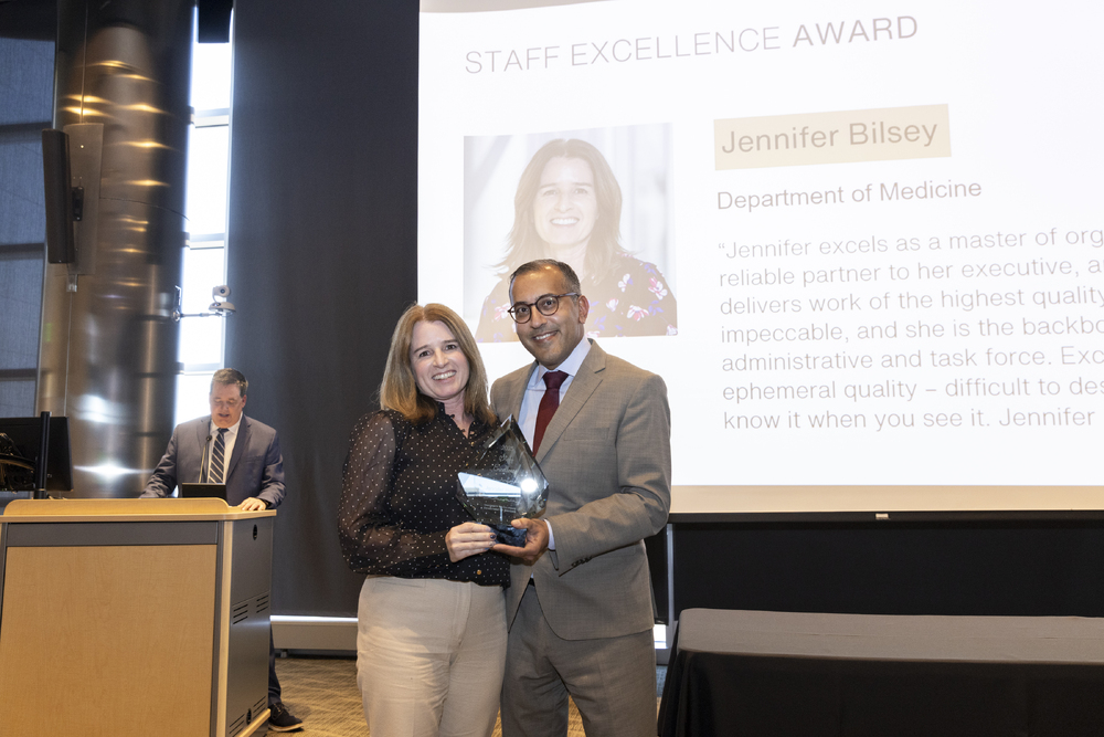 Jennifer Bilsey receiving a Staff Excellence Award from Vineet Chopra, MD, MSc, on April 21, 2025. Image by Justin LeVett.