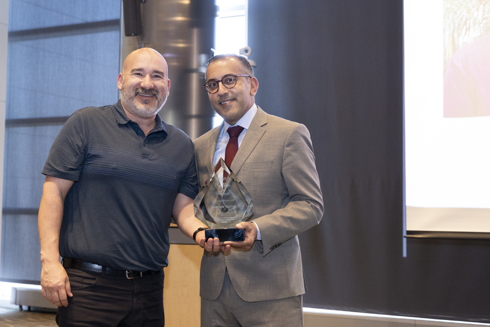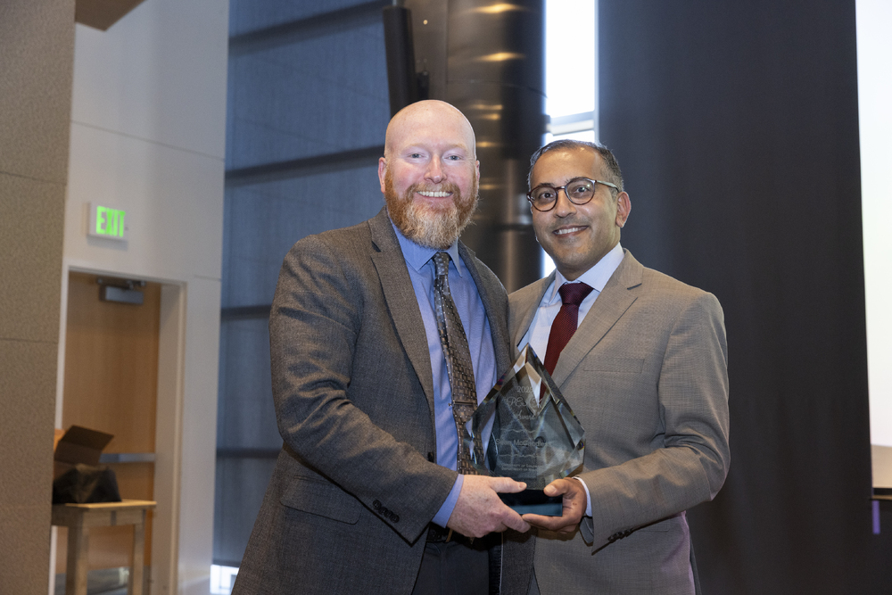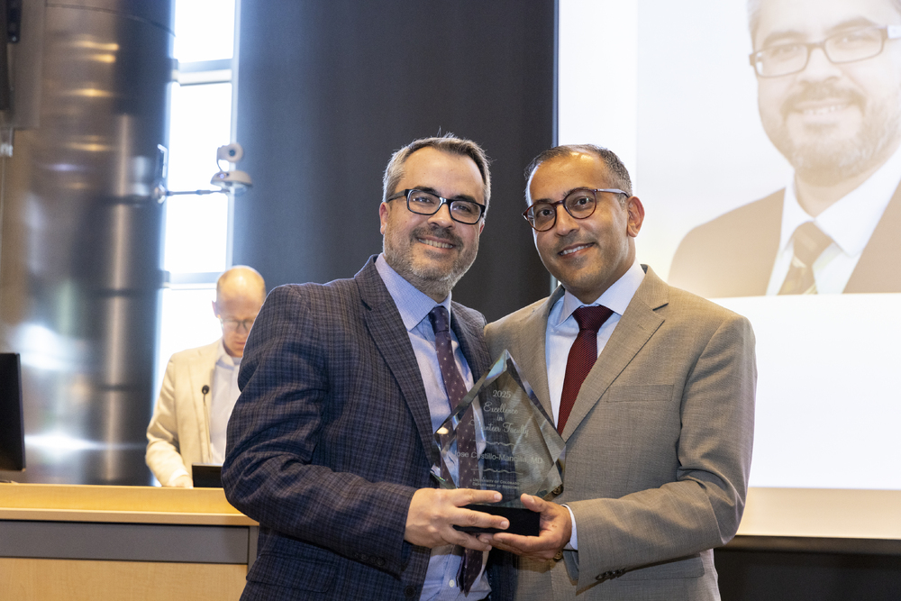 Jose Castillo-Mancilla, MD, a volunteer faculty member in the CU Department of Medicine, smiles with his award alongside Vineet Chopra, MD, MSc, on April 21, 2025. Image by Justin LeVett.