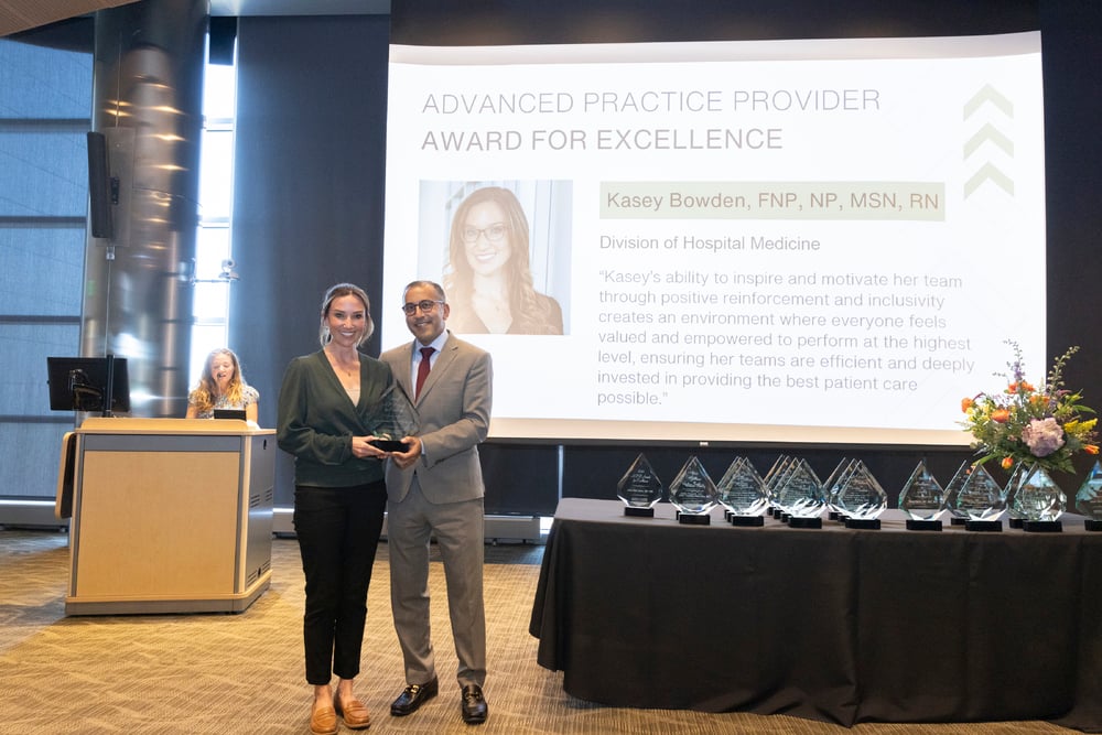 Kasey Bowden, FNP, NP, MSN, RN, smiles with Vineet Chopra, MD, MSc, while accepting an Advanced Practice Provider Award for Excellence on April 21, 2025. Image by Justin LeVett.