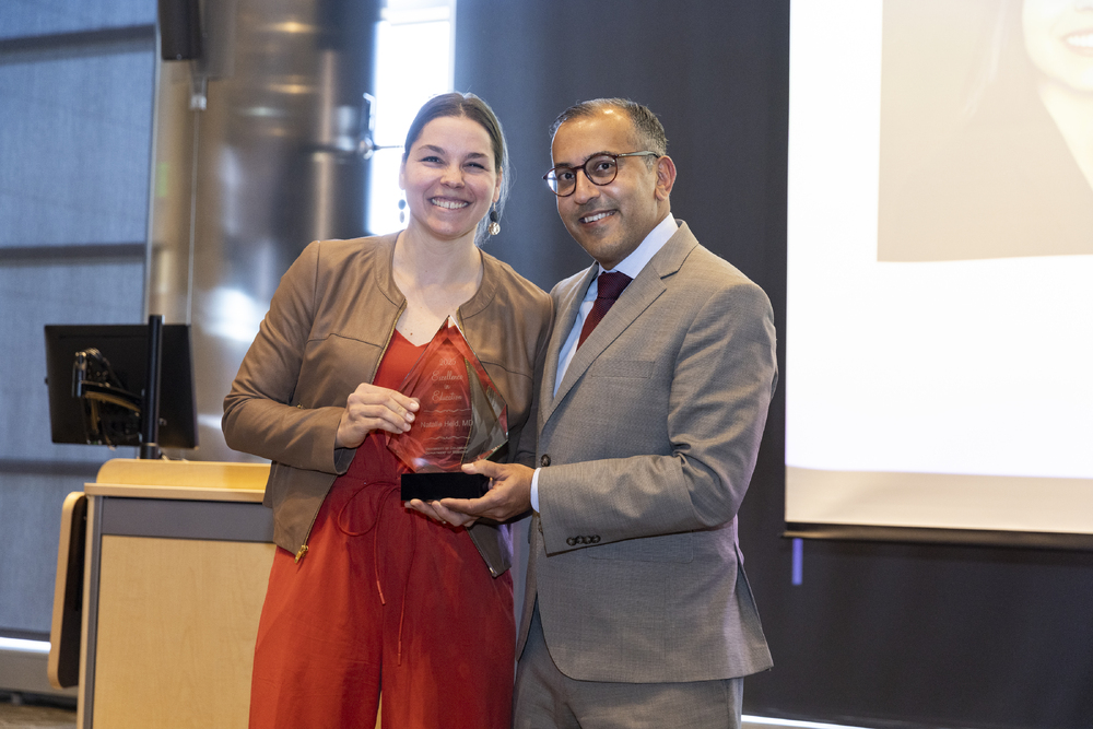 Natalie Held, MD, receiving an Excellence in Education Award from Vineet Chopra, MD, MSc, on April 21, 2025. Image by Justin LeVett.