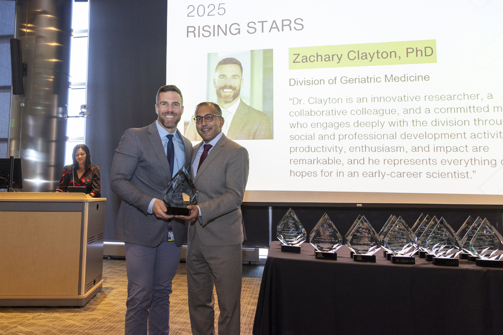 Zachary Clayton, PhD, an assistant professor of geriatric medicine, accepts a Rising Star Award from Vineet Chopra, MD, MSc, on April 21, 2025. Image by Justin LeVett.