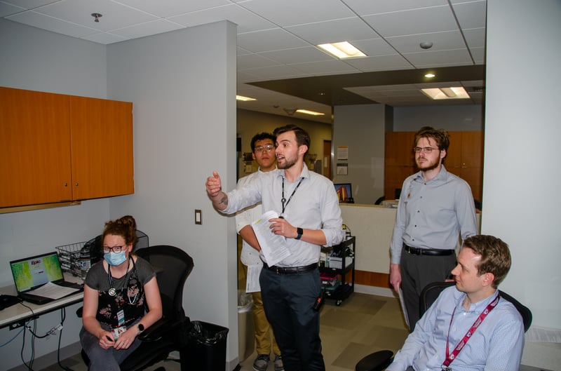 Jacob Plaisted, center, leading a “pre-clinic huddle” at DAWN Health, where he was a student director. Image courtesy of Plaisted.