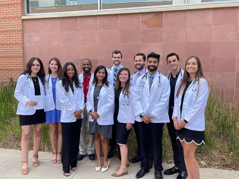 Jacob Plaisted, standing fourth from the right in the back row, smiles alongside other CU School of Medicine students. Image courtesy of Plaisted.