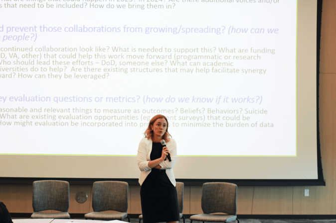 Last year’s meeting culminated in participants creating 10 recommendations to enhance firearm suicide prevention and interventions among service members. To foster teamwork, this year’s event closed with small breakout groups discussing opportunities for collaboration, barriers to collaborations growing and spreading, and key evaluation metrics for measuring outcomes.
