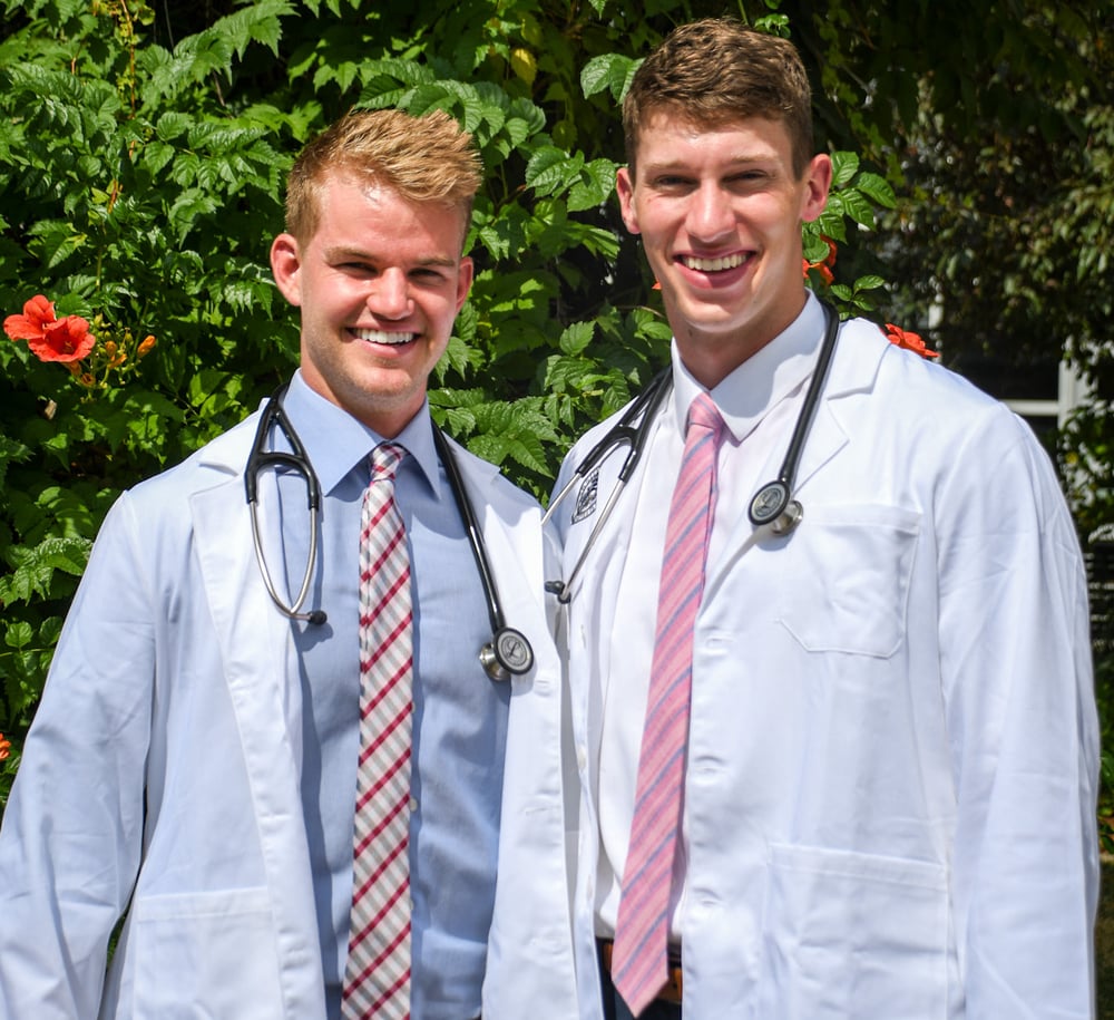 Daniel Saks, right, smiles alongside his friend and classmate Wilson Belk during CU’s white coat ceremony on July 30, 2021. Image courtesy of Saks.