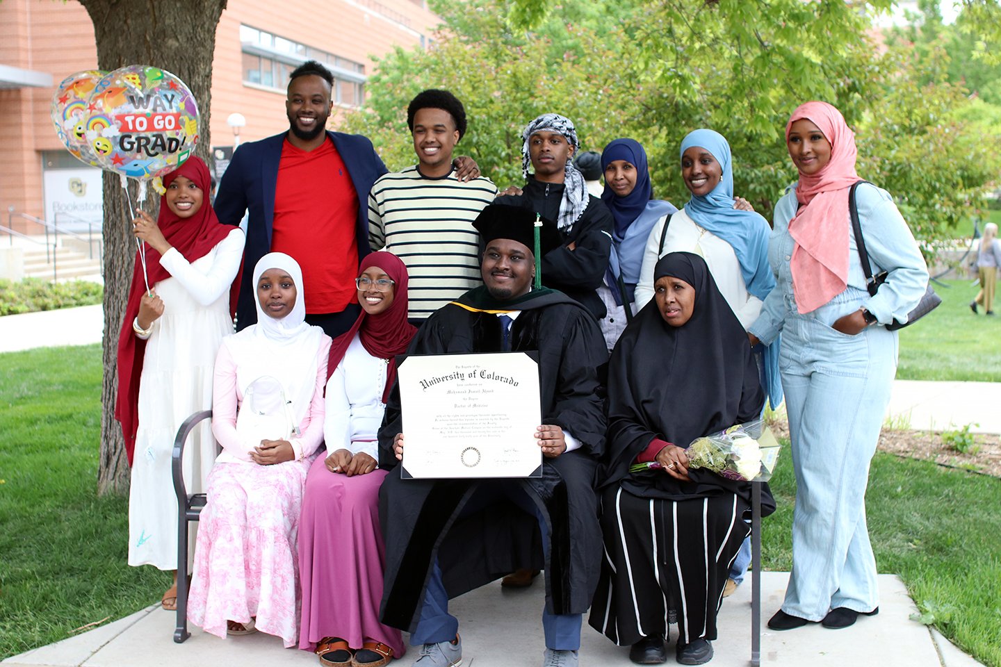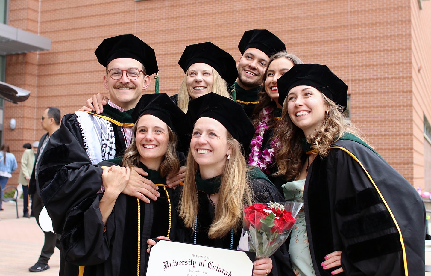 Then, one by one, the graduates were called to the stage to receive a hood representing their new profession, a ritual dating back to the Middle Ages. The hood is lined with CU’s colors, black and gold, and the dark green velvet trim signifies a medical degree.