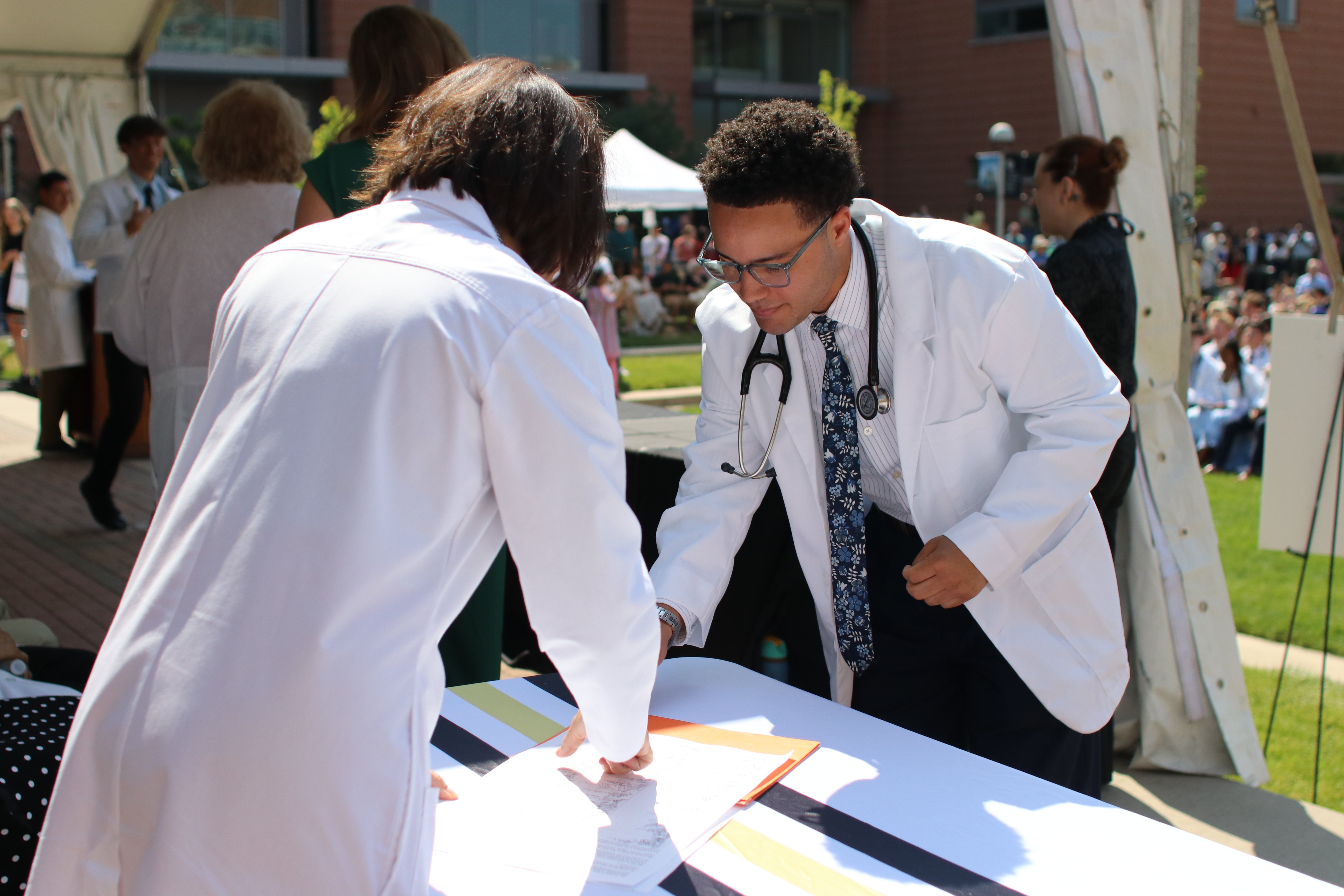 An incoming student signs their name to the Class of 2029 Honor Code after receiving their white coat and stethoscope.