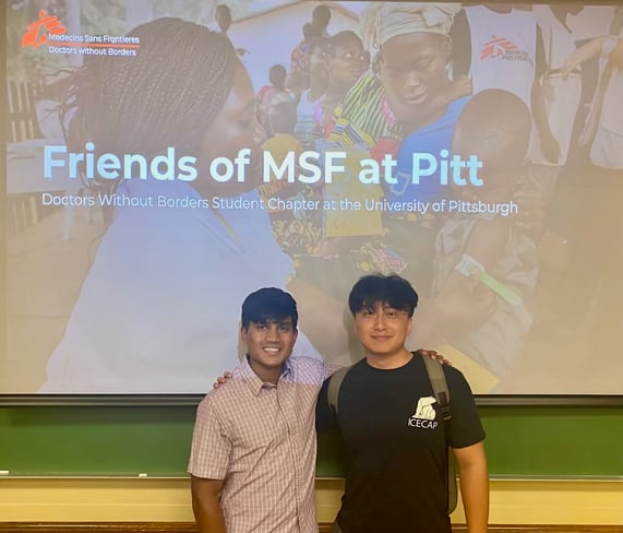Jaydep Halder, left, with another member following a Médecins Sans Frontières general body meeting. Halder served as president of the chapter his junior year of college.