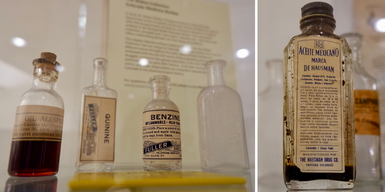 Hausman’s business venture produced and sold medicine and various elixirs for 90 years, well past his retirement in 1946. Today, remnants of the Hausman Drug Company still exist. A small bottle with a blue and white label that reads “Aceite Mexicano Marca De Hausman” sits on display at the Strauss Health Sciences Library on the University of Colorado Anschutz Medical Campus. The bottle was never completely emptied. A thick, dark goo lines the bottom of the container.