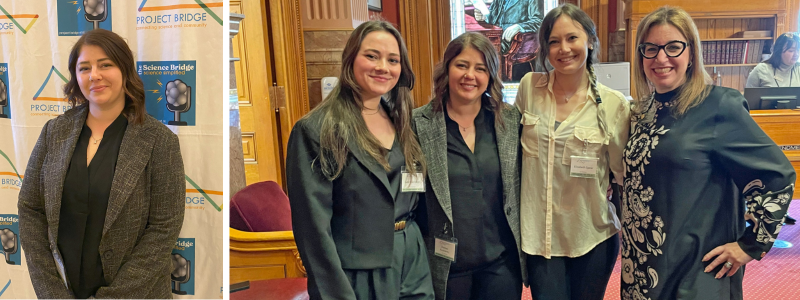 Left: Rachael Kostelecky, president of Project Bridge Colorado. Photo by Mark Harden | CU School of Medicine. Right: STEM Poster Day at the Capitol organizers Gabrielle Vragel, Kostelecky, and Elizabeth Spear pose with Colorado Senator Dafna Michaelson Jenet (right) in the state Senate chambers. Photo courtesy of Rachael Kostelecky.