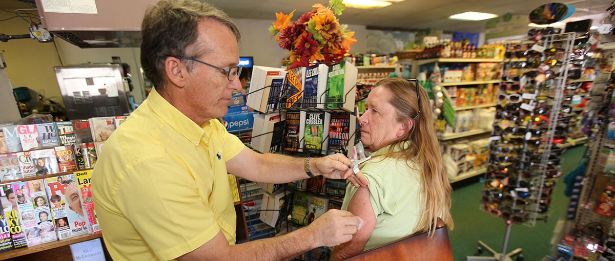 Don Colcord gives a flu shot to a customer at his Nucla pharmacy. Photos by Chris Casey.