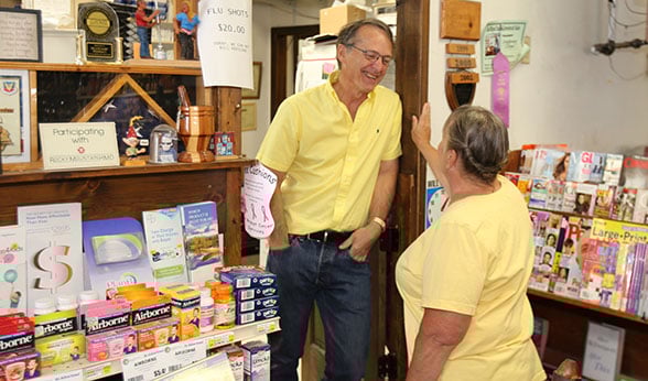 Don Colcord chats with longtime friend and customer Susan Rice at his pharmacy.