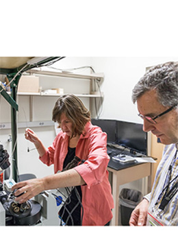 Emily Gibson and Diego Restrepo working on the miniature microscope that allows them to see inside a living brain.