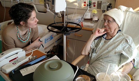 Megan Griff, MD, chats with University of Colorado Hospital patient Frances Cory as part of a program aimed at teaching the value of compassion in medicine.