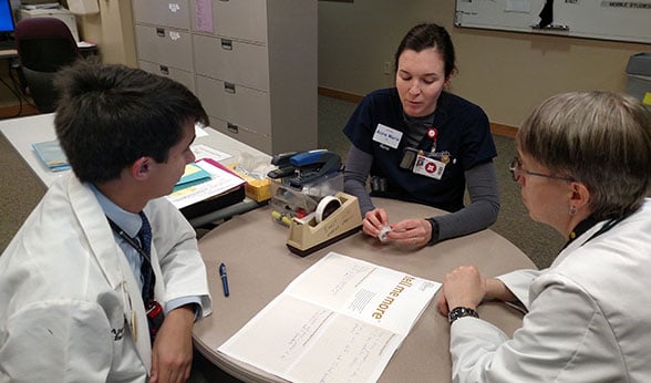 Ajay Major, MD, MBA, left, and Jeannette Guerrasio, MD, right, talk with Anne Marie Fleming, RN, about the Tell Me More program.
