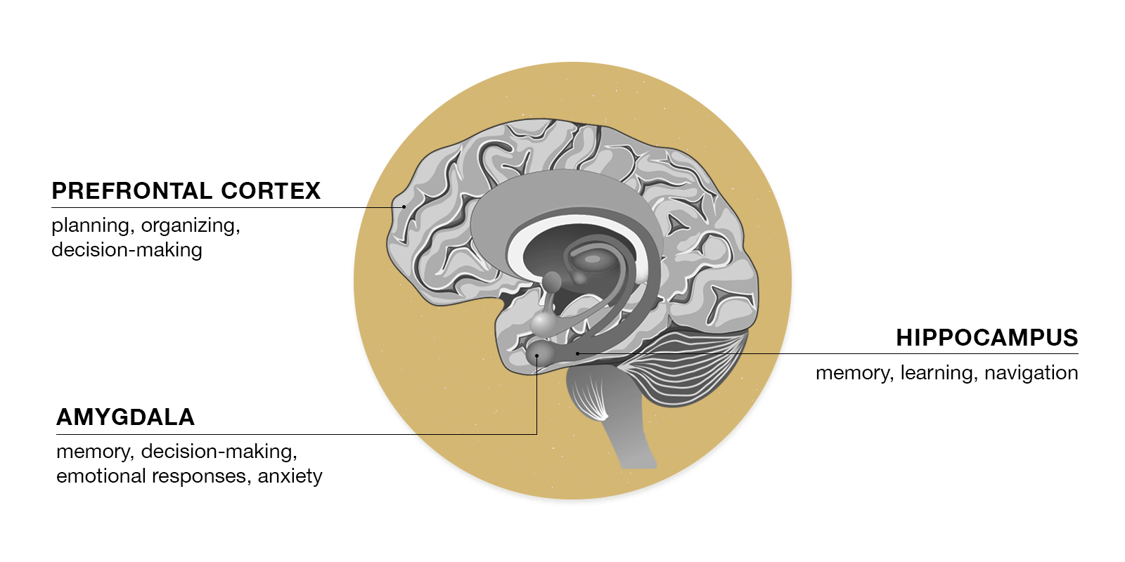 The brain has many areas that are affected by estrogen. For example, the pre-frontal cortex is responsible for things like planning and organizing, while the hippocampus is critical for memory and learning. And the amygdala helps regulate emotions and anxiety.