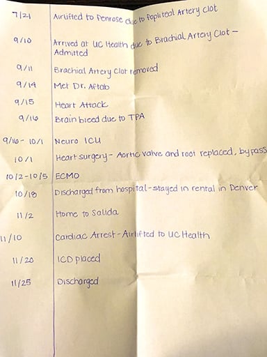 In hospitals from Salida to Colorado Springs to Aurora, Kelsey chronicled every step of Brian’s improbable journey. From July 21 to Nov. 25, she jotted 14 entries in her journal, beginning with “Airlifted to Penrose (St. Francis Hospital) due to popliteal artery clot.”