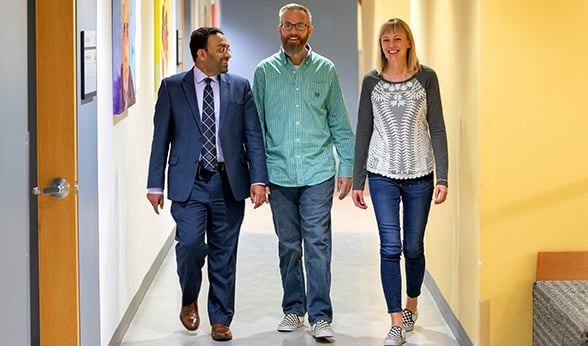 From left, Muhammad Aftab, MD, Brian McNeill and Kelsey McNeill walk down the hall outside Dr. Aftab's office in the Academic Office Building.
