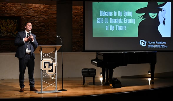 Scott Arthur, vice chancellor of advancement at the CU Anschutz Medical Campus, welcomes alumni and their friends and family to the performance of "Wicked" on June 5.