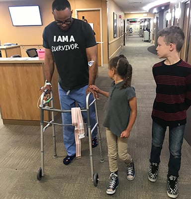 After his May 1 surgery, Denver Councilman Albus Brooks walks with two of his children — Kaya and Makai — at University of Colorado Hospital.