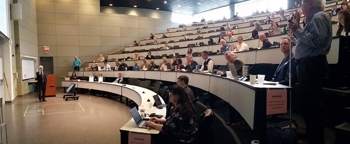 Dr. Jonathan Samet, dean of the Colorado School of Public Health (far left), fields a question from an audience member at the Air Quality & Health Symposium.