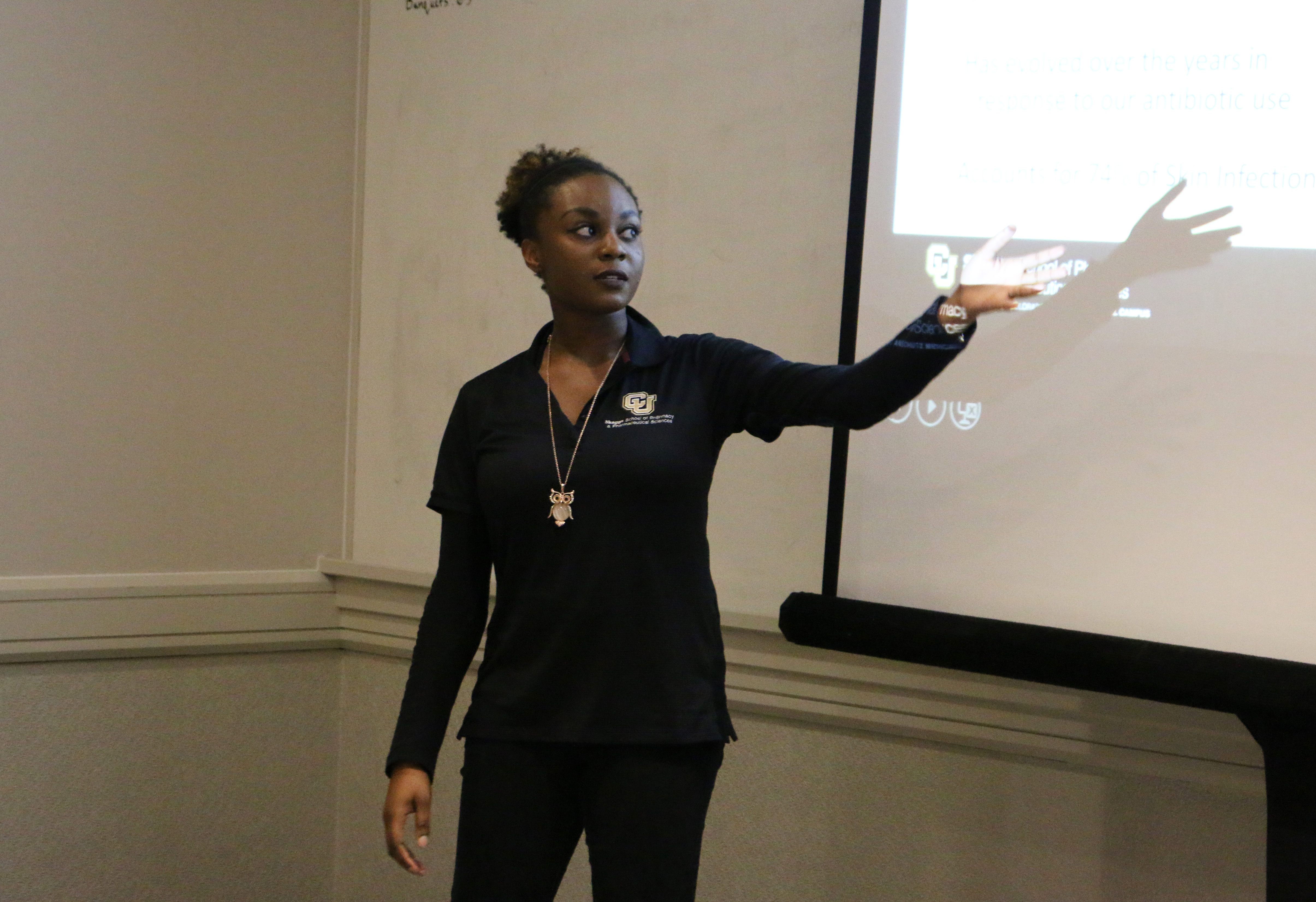 Second-year students Nedra Chijioke and Armen Fstkchian conducted a workshop on antibiotic resistance and infectious disease, and third-year students Dianne Kitt, Mackenzie Poole and Wendy Serrano presented on painkillers.