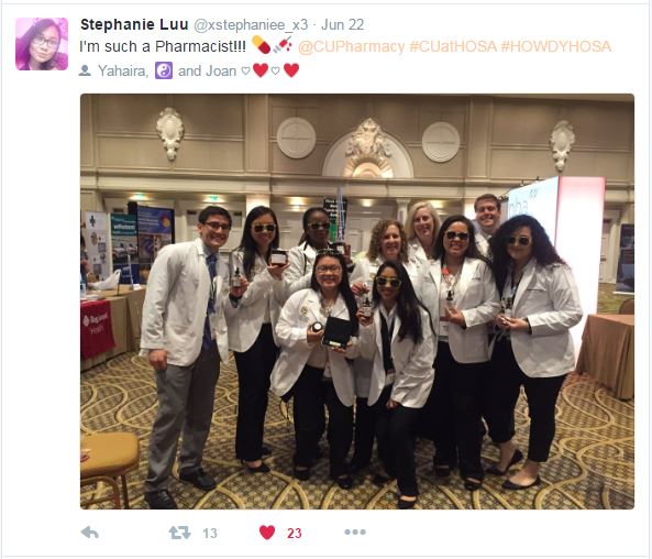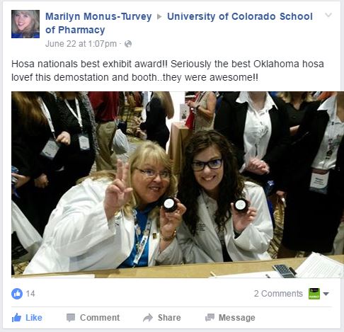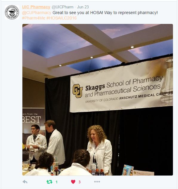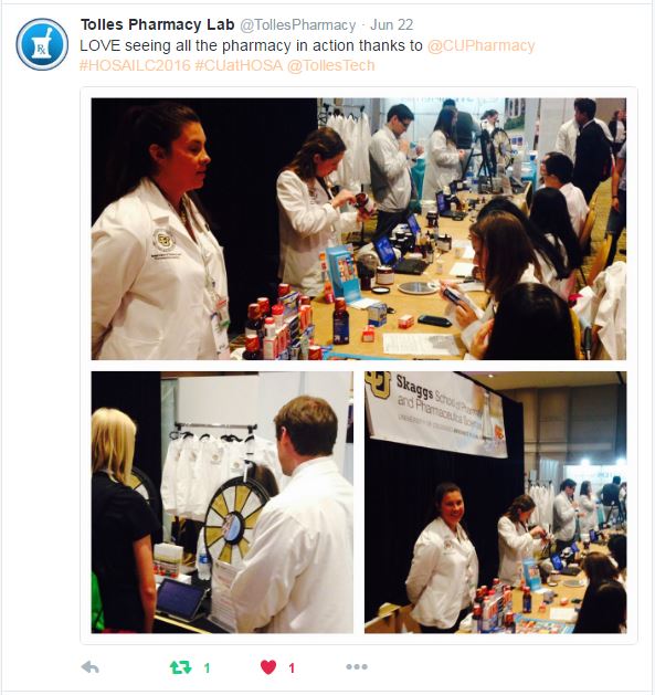 Finally, Dr. Jarvis’s presentation highlighted pharmacy practice skills demonstration events hosted by CU at Colorado HOSA state conferences in 2015 and 2016 and the push to make pharmacy a better recognized career pathway within HOSA.